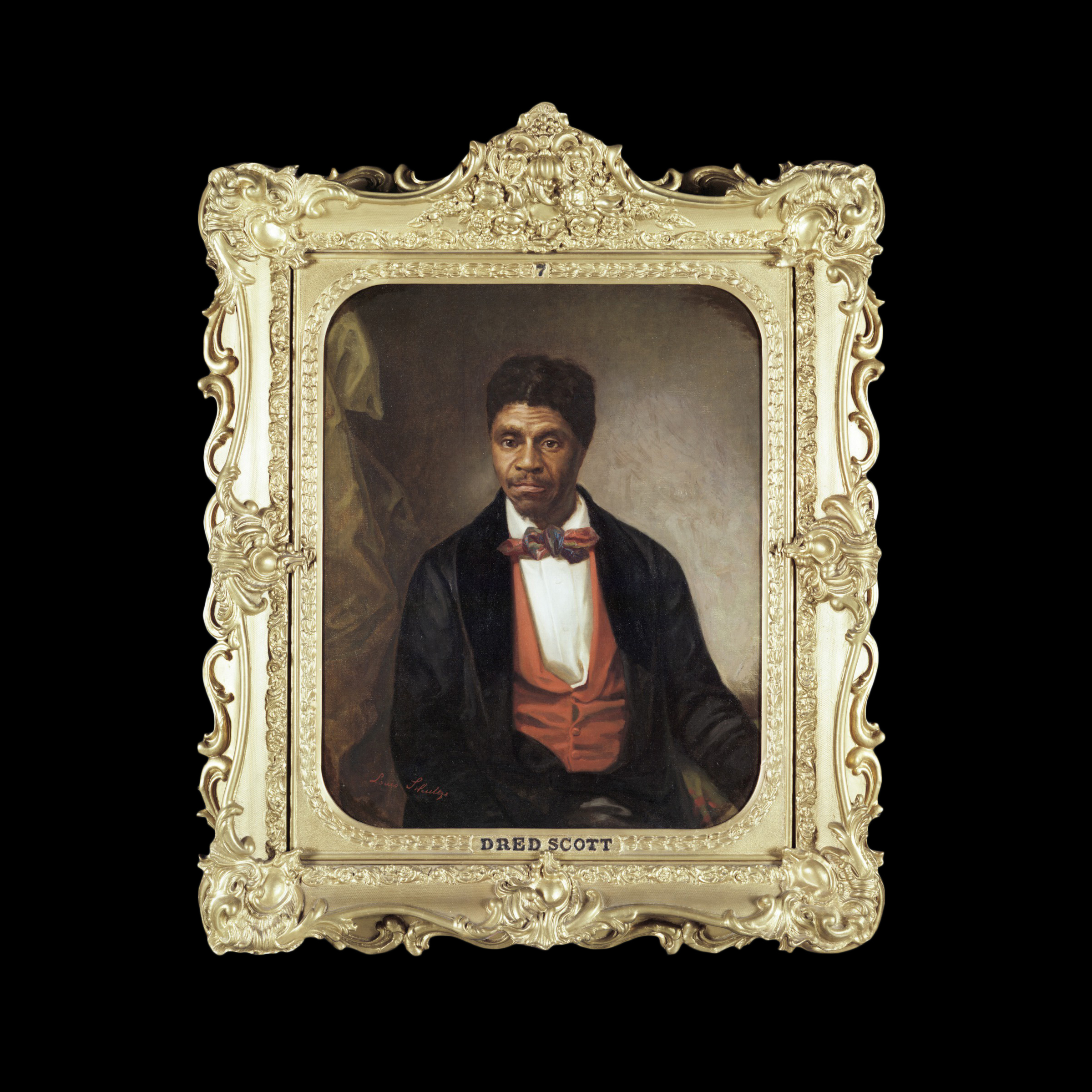 This portrait of Dred Scott was painted by German-born St. Louis artist Louis Schultze (c. 1820 – 6 February 1901). The painting was commissioned by the Missouri Historical Society in 1888 as part of a series of portraits of prominent St. Louis residents and was paid for by African American citizens of the city. Schultze painted the portrait sometime before 1897 and based it on a daguerreotype of Scott taken by John G. Fitzgibbon in St. Louis in 1857.